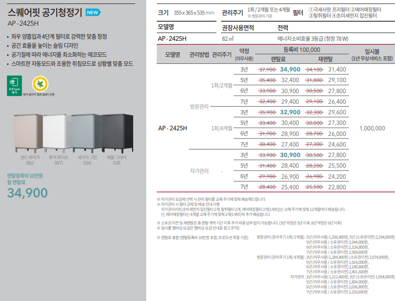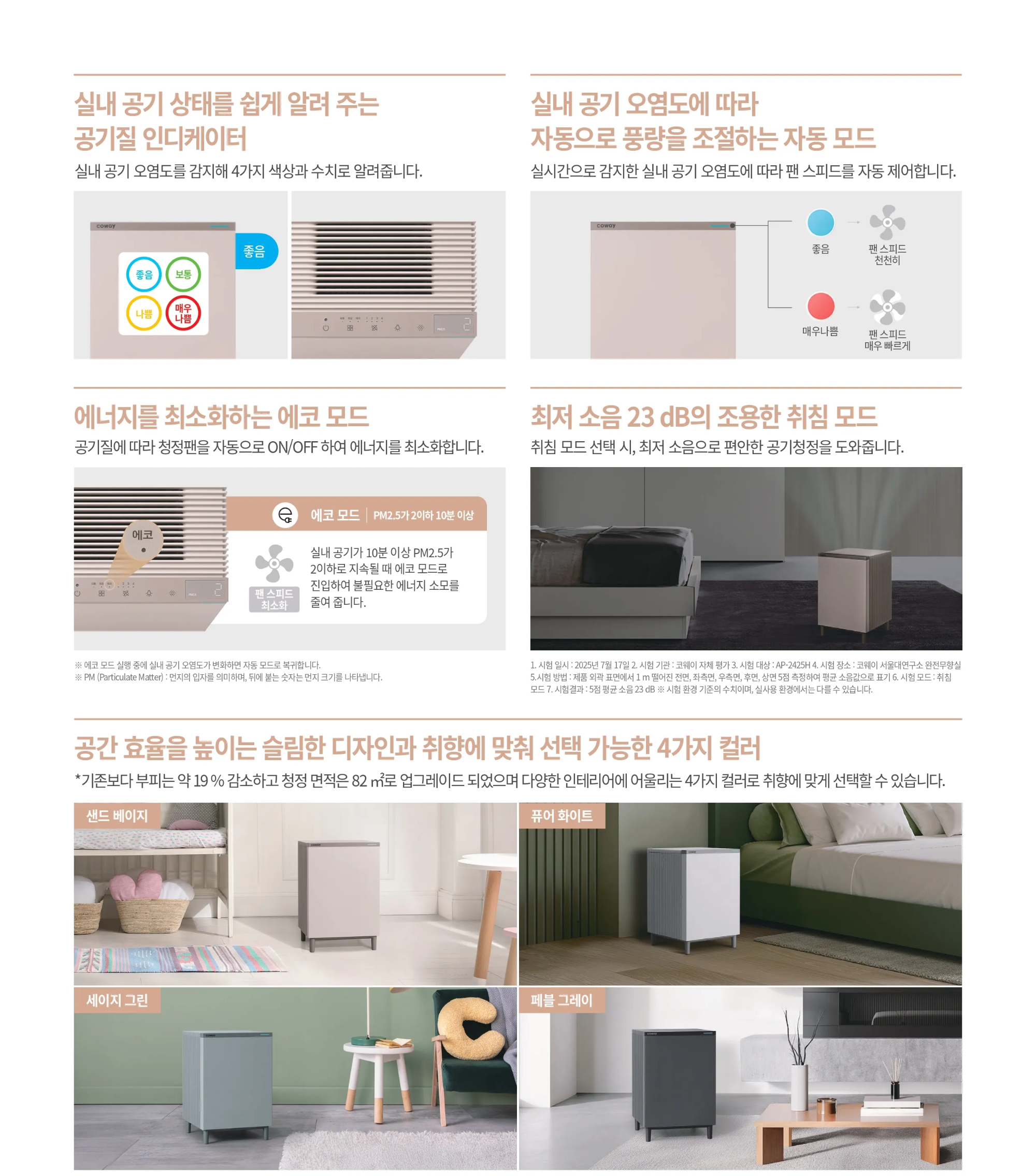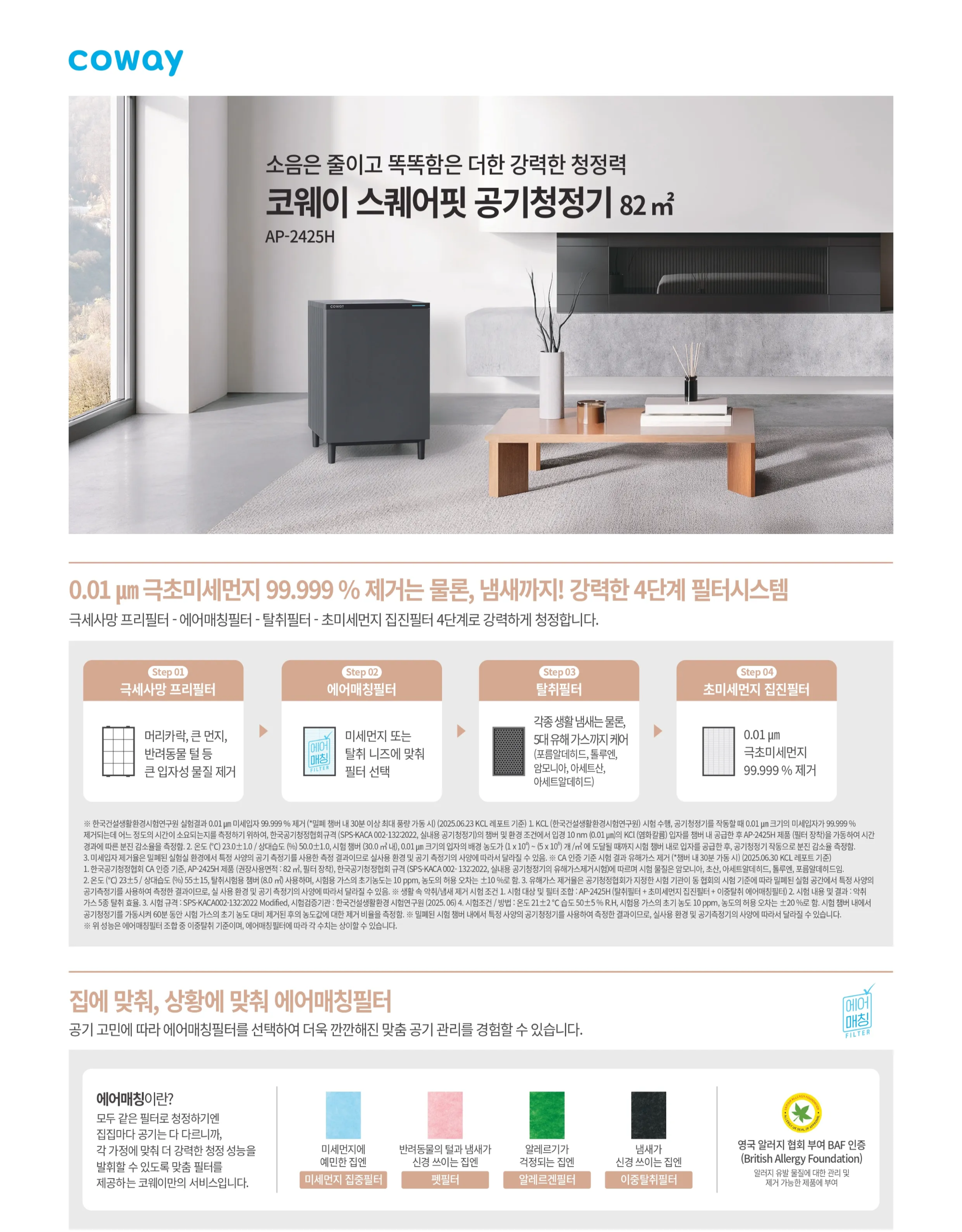 코웨이 스퀘어핏 공기청정기 AP-2425H 모델은 82㎡(약 25평)의 넓은 공간을 효율적으로 관리할 수 있도록 설계된 제품입니다. 강력한 정화 성능과 함께 사용자 편의성을 극대화한 스마트 기능, 그리고 공간 활용도를 높이는 슬림 디자인이 특징입니다.