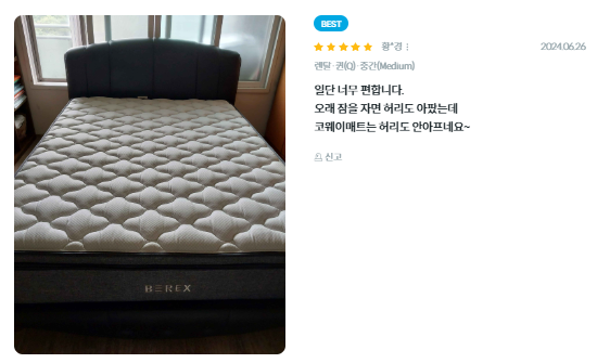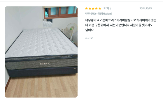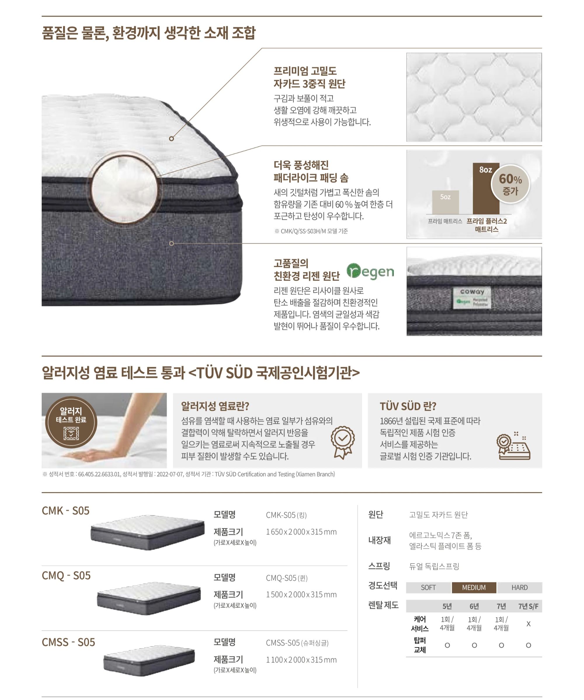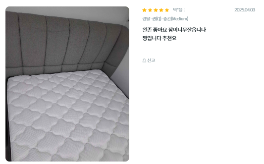 - 내장재: 에르고노믹스 7존 폼, 엘라스틱 플레이트 폼 등으로 구성됩니다.