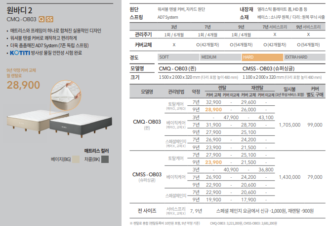 추천 가격 : 7년 약정, 토탈케어 = 퀸 32,900원 / 슈퍼싱글 27,900원
