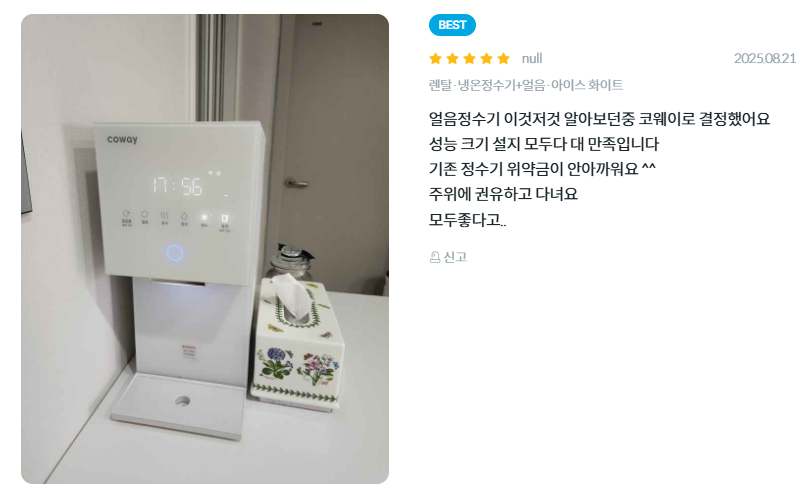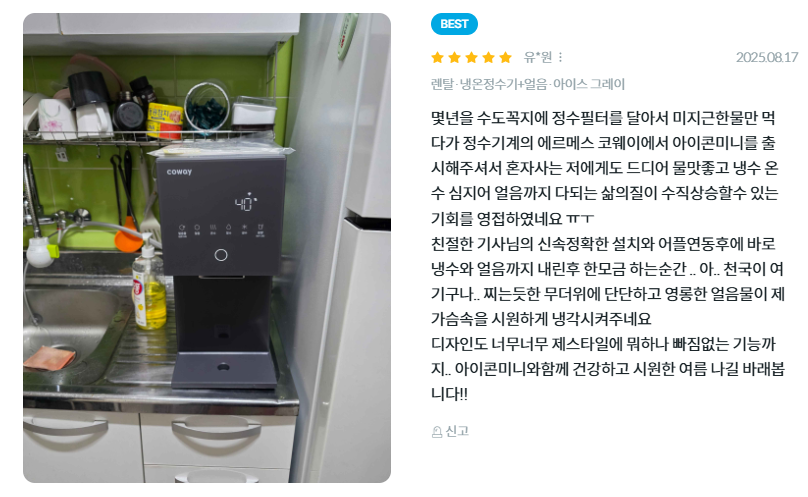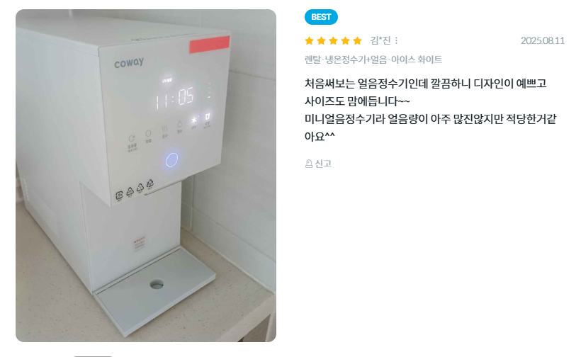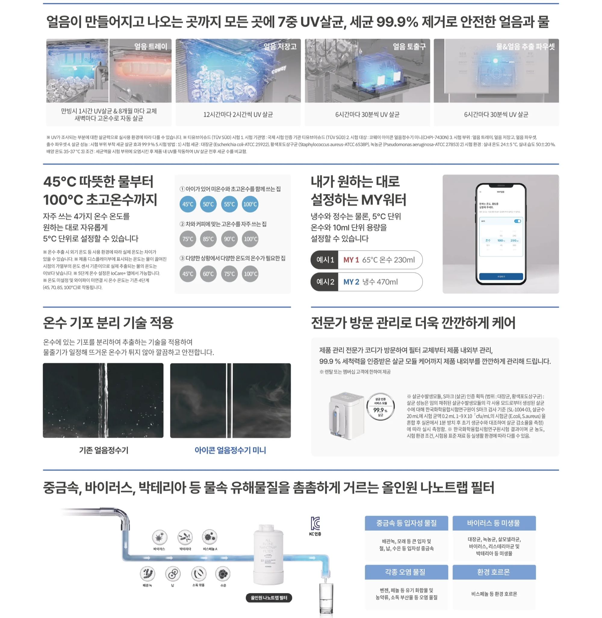 국내 최소 사이즈의 얼음 정수기로, 좁은 주방 공간에 최적화된 컴팩트한 디자인과 뛰어난 위생 및 정수 성능을 제공합니다.
