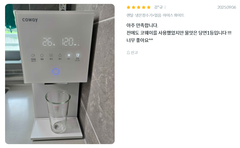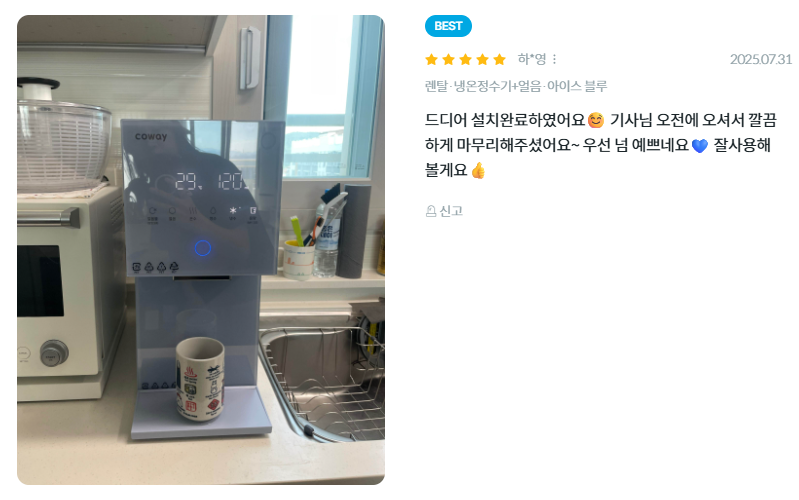- 하트서비스: 제품 관리 전문가인 코디가 방문하여 필터 교체, 제품 내외부 관리, 살균 모듈 케어 등의 깐깐한 위생 관리 서비스를 제공합니다.