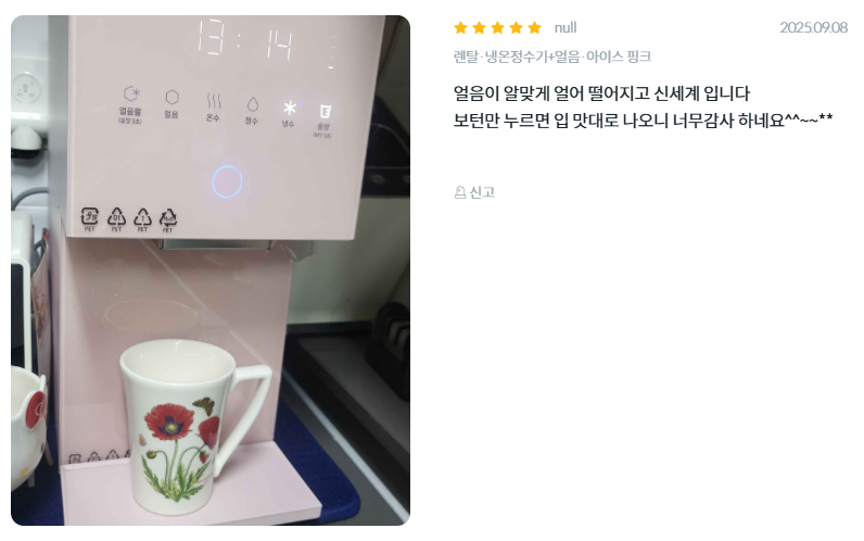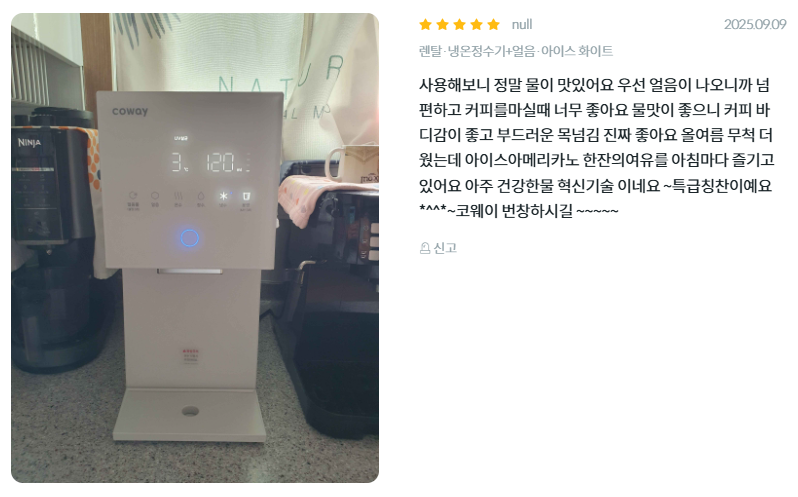 - 에너지 효율: 냉수 0.5A, 온수 2750W, 제빙 70W의 전력을 소비하며, 최저소비효율기준을 만족합니다.