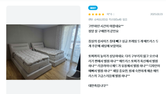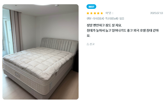 - 매트리스: 패더라이크 텐셀 패딩, 브리즈 메모리폼, 얼티밋HD폼 등으로 구성됩니다.
