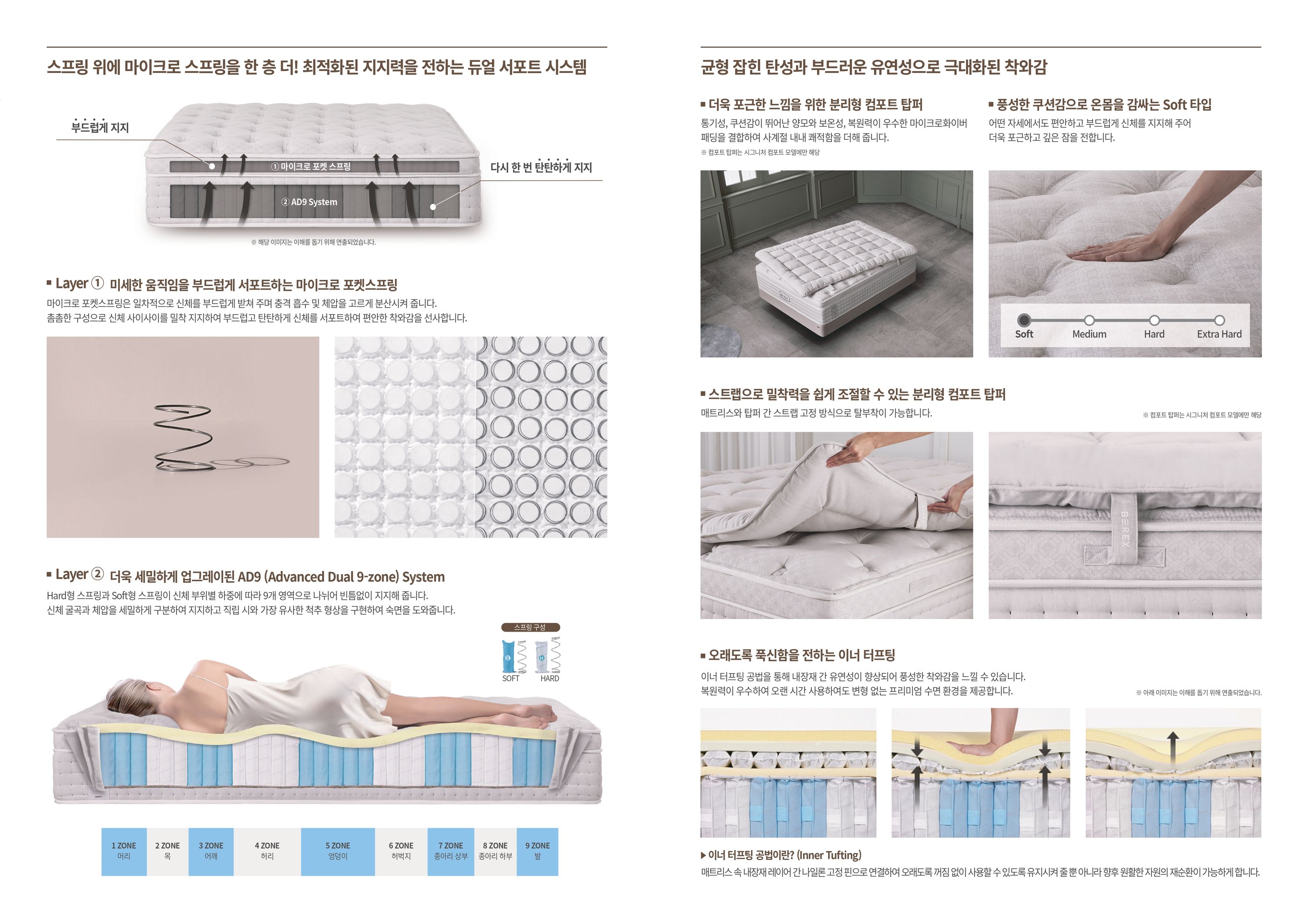 - 듀얼 서포트 시스템: 마이크로 포켓스프링과 AD9 시스템(9존 독립스프링)으로 구성되어 부드럽고 탄탄한 지지력을 제공합니다.