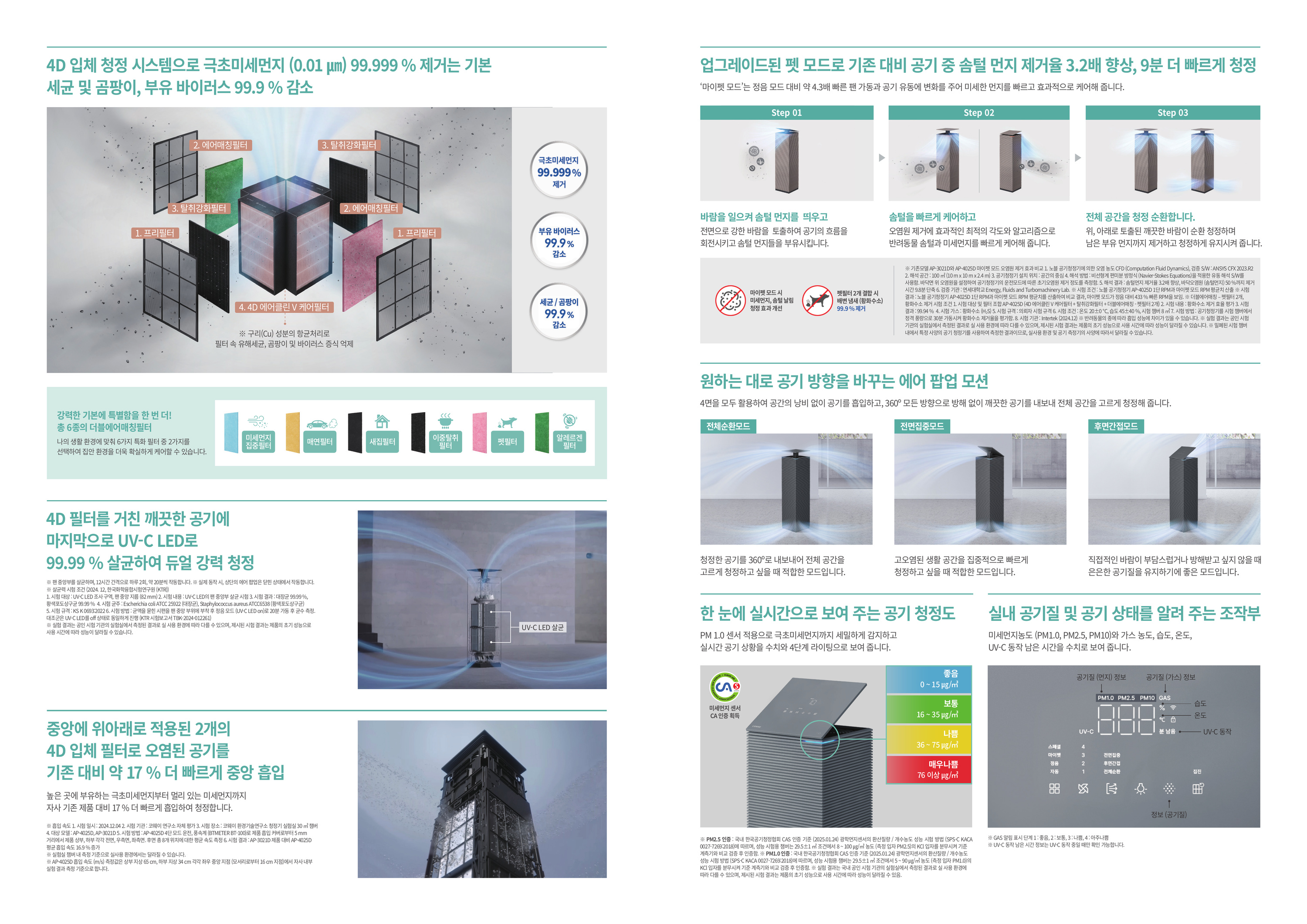 - 상하 4D 입체 청정 시스템: 공기를 4면으로 흡입하고 360° 모든 방향으로 내보내어 공간 전체를 고르게 빠르게 청정합니다.