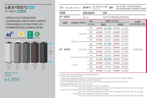 - 서비스 내용: 필터 교체 (더블 에어매칭필터는 4개월 또는 6개월마다, 멀티큐브 탈취강화필터와 4D 에어클린 V 케어필터는 12개월마다 교체), 제품 내외부 관리, 오염도 센서 점검, 프리필터 세척, 외관 클리닝 등이 포함됩니다.