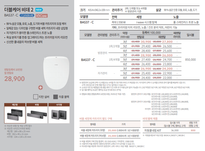 - 듀얼 케어: BAS-37C는 99% 살균 인증 모듈을 통해 유로, 노즐, 도기 및 버블 카트리지를 듀얼 케어합니다. 또한, 버블 세척 카트리지가 내장되어 일체감 있는 디자인을 제공하며, 신선한 허브향 버블 세척이 가능합니다. 허브향 버블 세정제 카트리지 방문관리 교체 서비스 대상 제품이기도 합니다.
