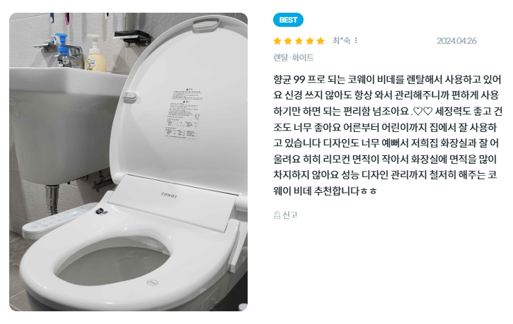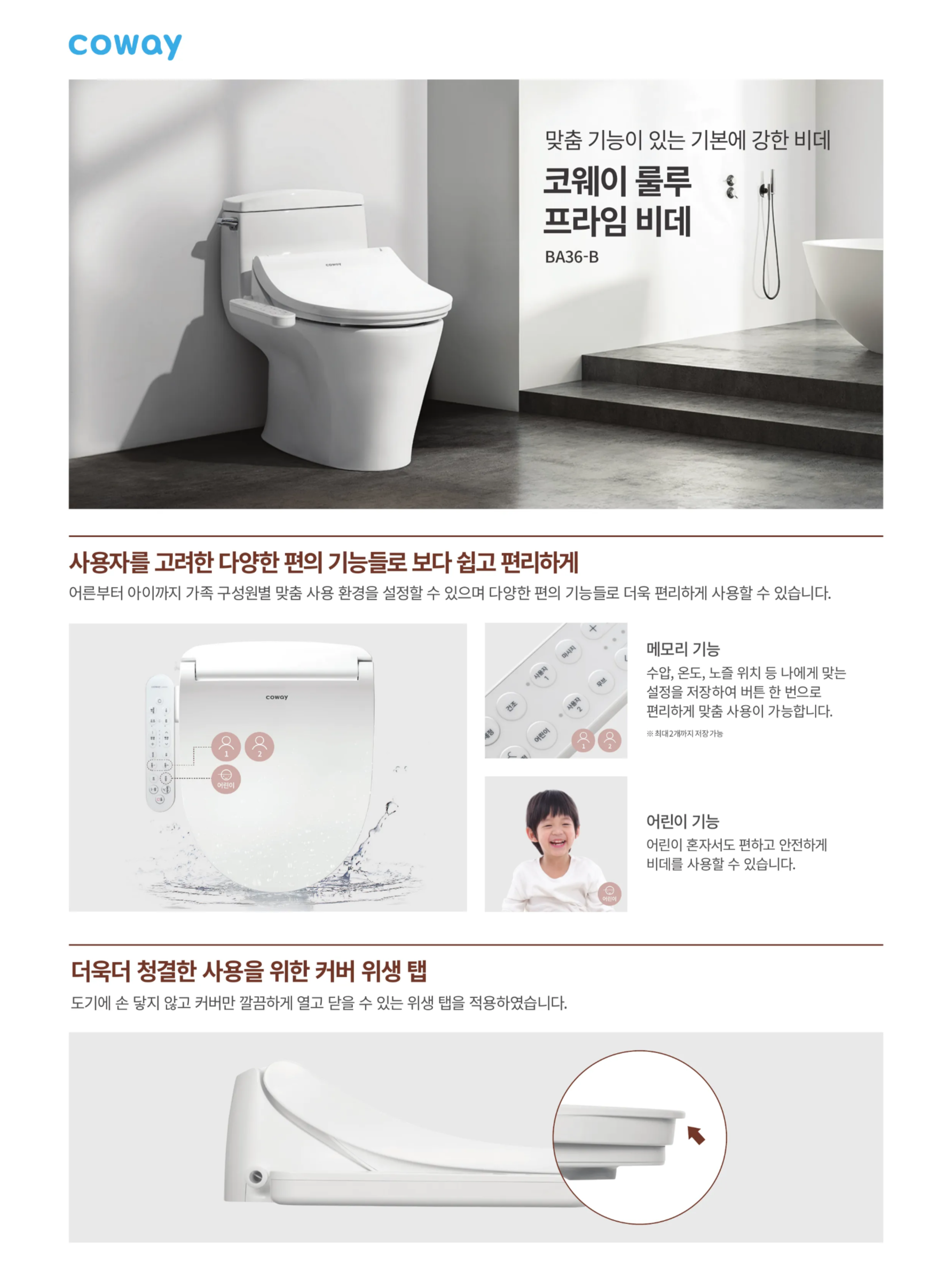 - 위생 관리: 변좌 커버에 위생 탭이 적용되어 깔끔하게 개폐할 수 있도록 돕습니다. 노즐/건조 분리 덕트와 어린이 기능도 포함되어 있습니다.