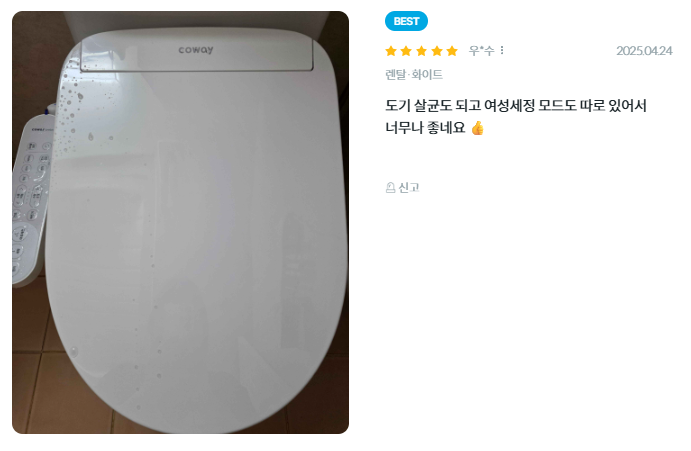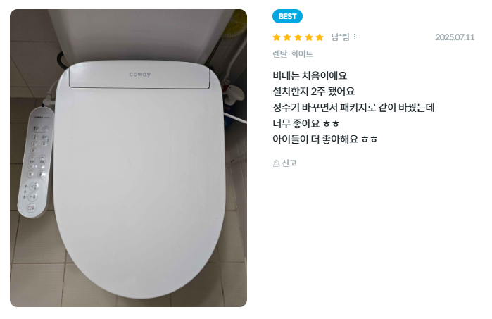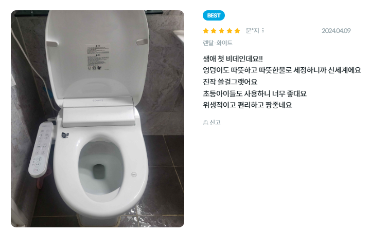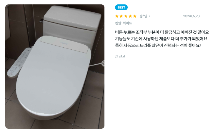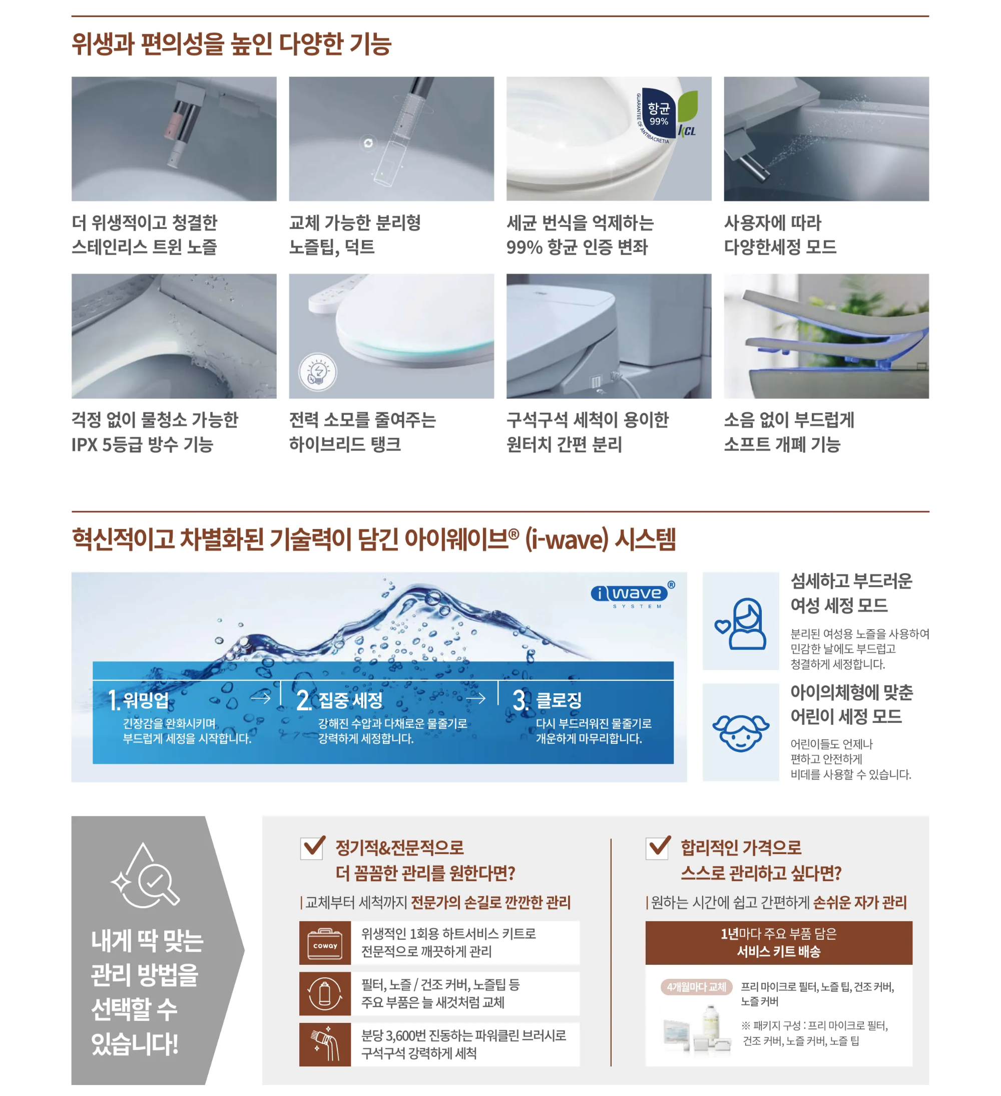 - 세정: i-wave 시스템이 탑재되어 있으며, 스테인리스 트윈 노즐을 사용합니다. 노즐/건조 분리 덕트 및 어린이 기능도 포함되어 있습니다.
