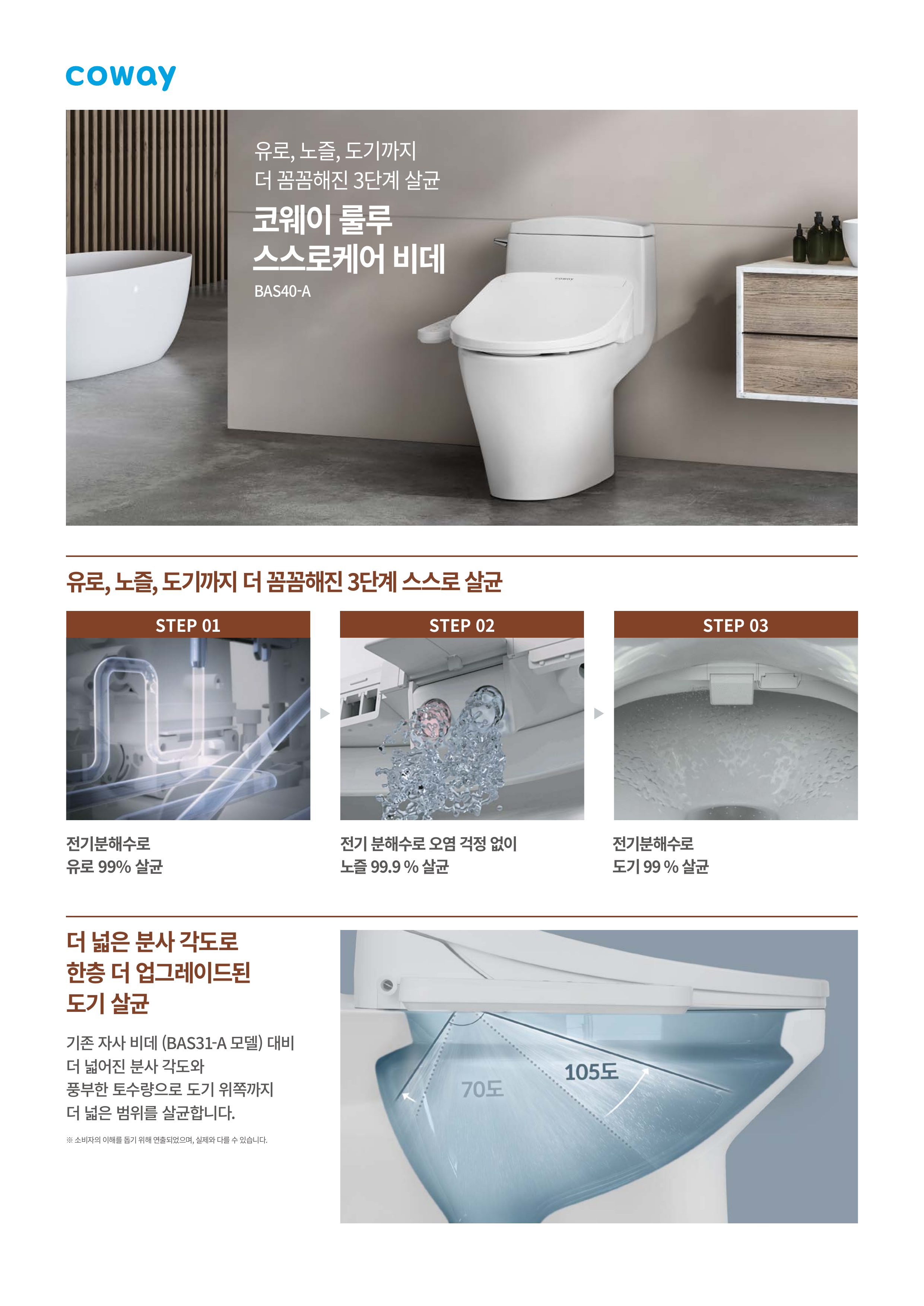 - 99% 살균 인증 모듈: 살균 인증 모듈의 살균수가 유로, 노즐, 도기를 케어하여 위생적입니다.