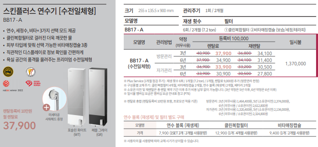 - 구성품별 교체 주기: 클린복합필터는 4개월, 비타매칭캡슐은 2개월, 연수 블록(재생제)은 2개월, 배터리는 2개월마다 교체됩니다