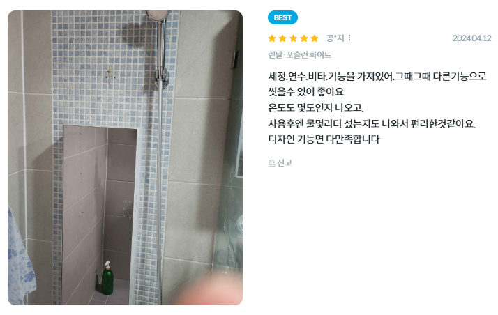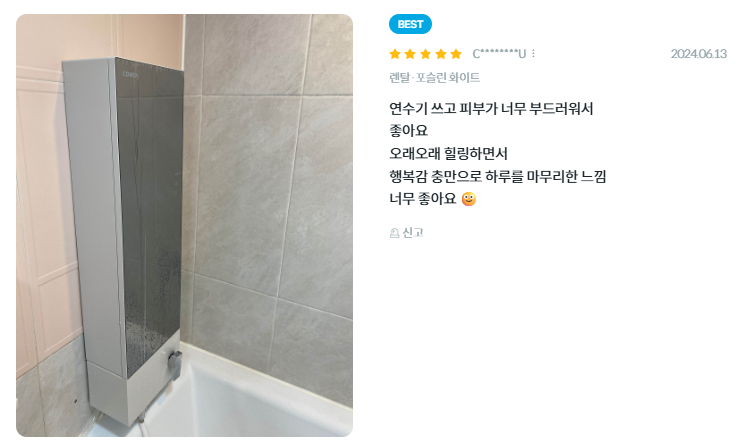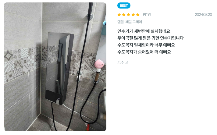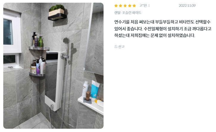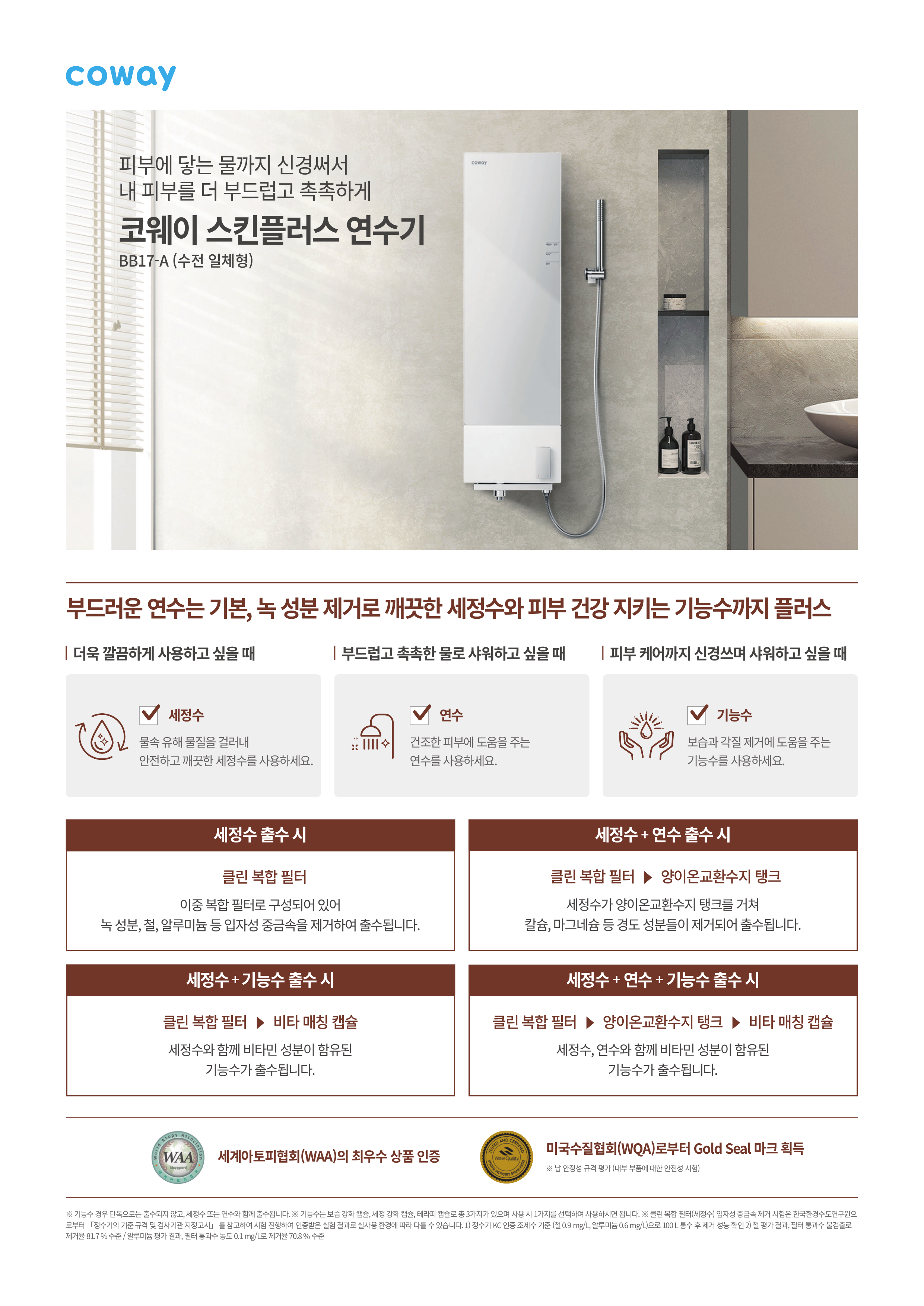 - 3가지 선택 모드: 연수, 세정수, 비타+의 세 가지 모드를 제공하여 피부에 닿는 물을 더욱 부드럽고 깨끗하게 관리할 수 있습니다.