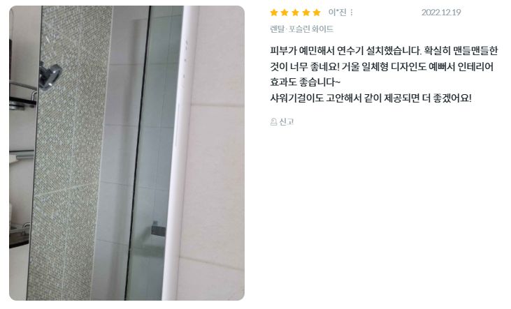 - 프리미엄 수전일체형 디자인: 욕실 공간의 품격을 높이는 고급스러운 미러 디자인과 2가지 컬러(포슬린 화이트, 페블 그레이)로 욕실 인테리어를 완성할 수 있습니다.