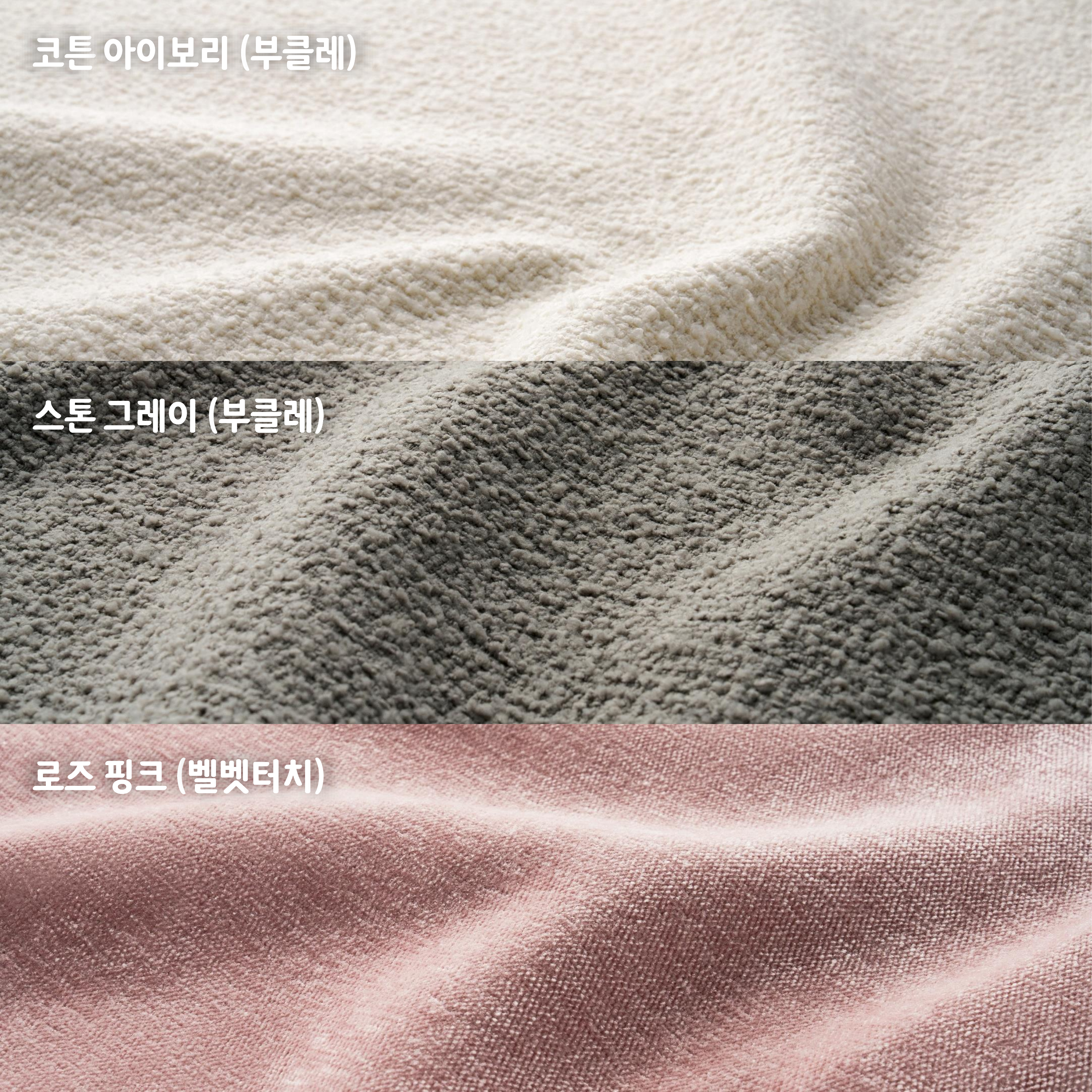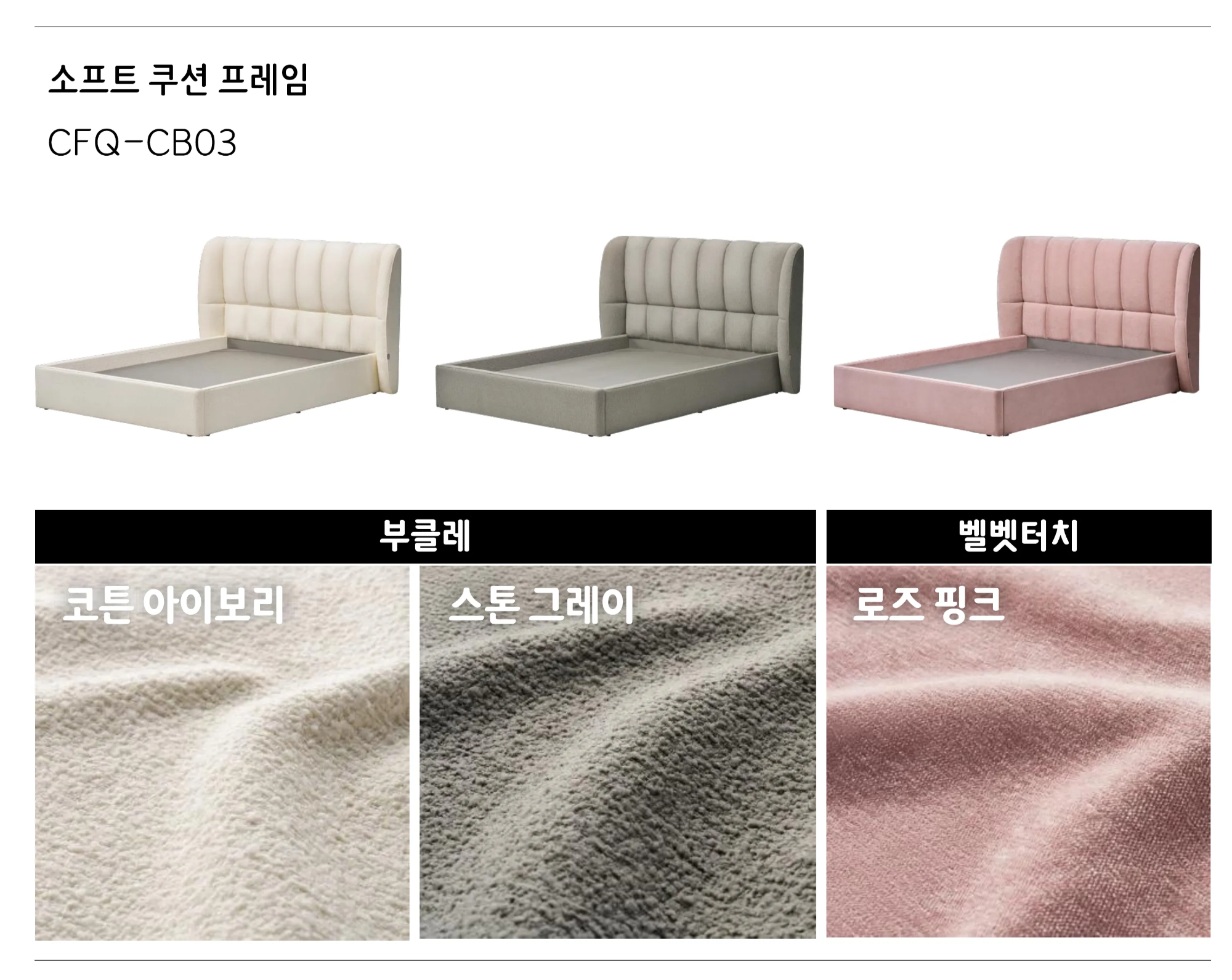 - 색상 및 패브릭: 코튼 아이보리(부클레), 스톤 그레이(부클레), 로즈 핑크(벨벳터치) 세 가지 색상으로 제공됩니다. (슈퍼싱글 사이즈(CFSS-CB03)는 킹/퀸 사이즈와 헤드부 높이 및 디자인에 차이가 있습니다).