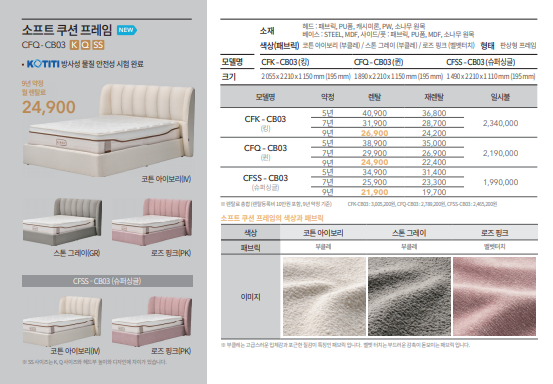 - 크기: 퀸(Queen) 사이즈 CFQ-CB03은 가로 1,890 mm x 세로 2,210 mm x 전체 높이 1,150 mm이며, 바닥부터 매트리스 안착부까지의 높이는 195 mm입니다. 킹(King), 슈퍼싱글(Super Single) 사이즈도 제공됩니다.