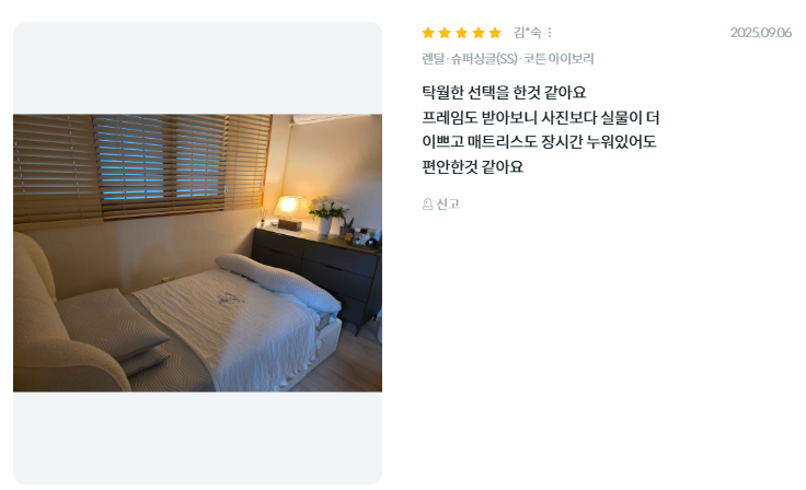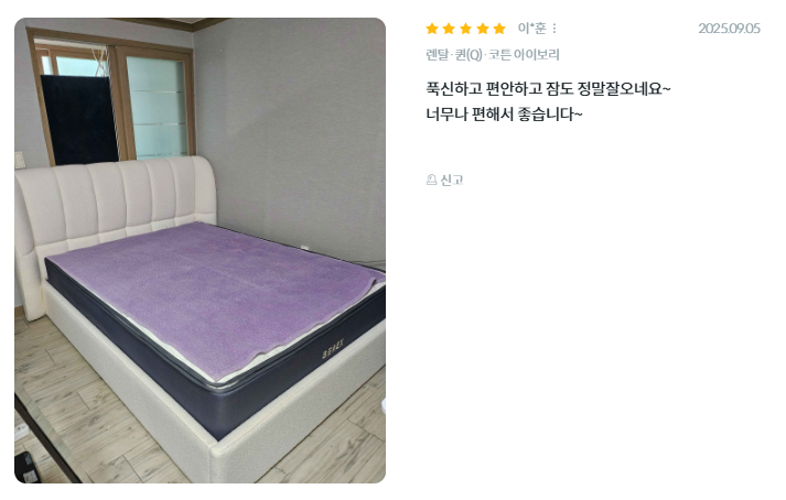 - 매트리스 별도: 프레임 제품 이미지 내 상단 매트리스는 별도로 구매해야 하며, 프레임만 단독으로 사용하는 것은 불가합니다. 프레임 단독 렌탈 시 케어 서비스는 제공되지 않습니다.