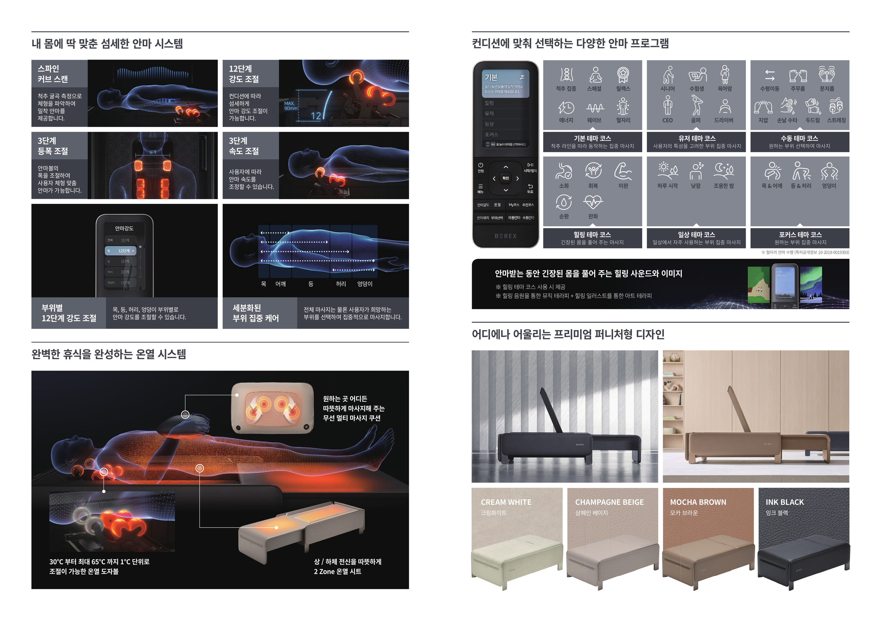 - 전문 안마 기술력: 최적화된 안마 프로그램과 다양한 동작이 가능한 멀티 모션 3D 안마 모듈을 적용했습니다.