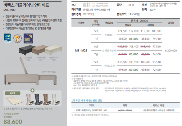 - 리프레쉬 서비스: 36개월 차에 1회 제공되며, 헤드 쿠션, 어깨 패드, 등 & 엉덩이 패드, 발 패드 등 몸에 닿는 부위를 교체해줍니다.