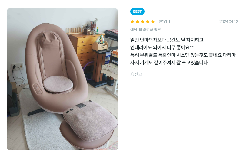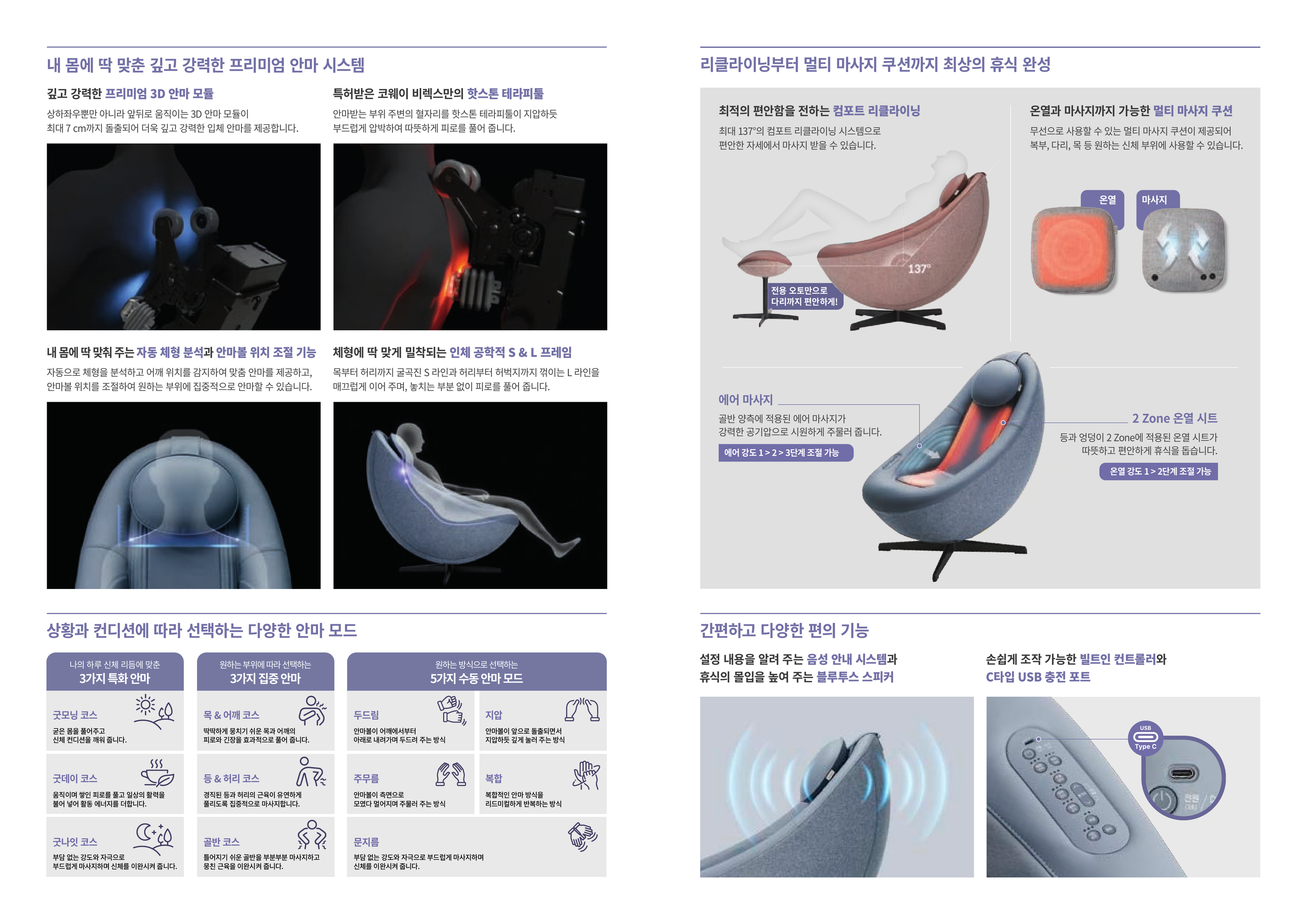 - 핫스톤 테라피툴과 온열패드 및 온열쿠션이 적용되어 있습니다.