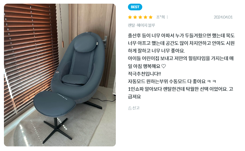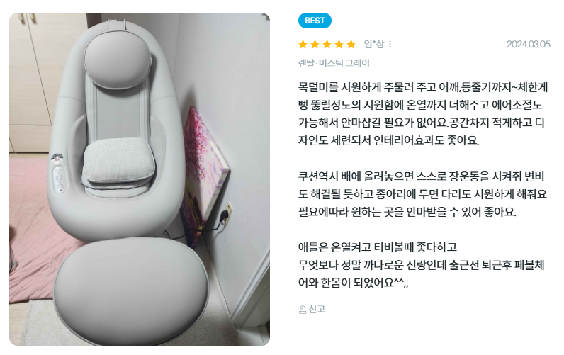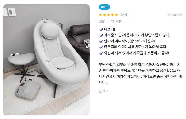 - 안마와 온열이 가능한 2-in-1 무선 온열쿠션이 포함됩니다.