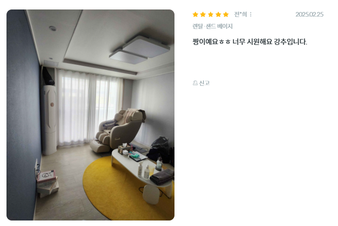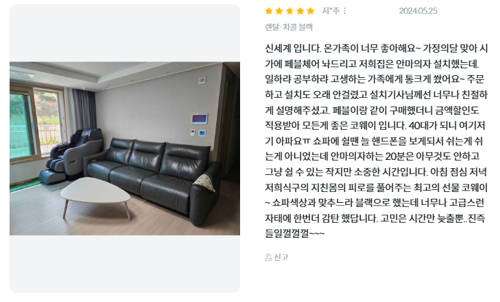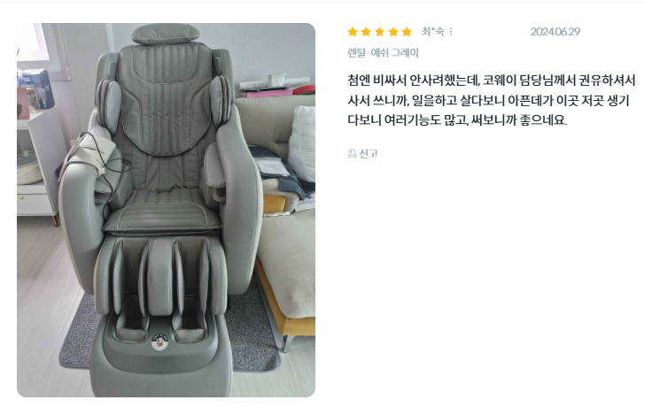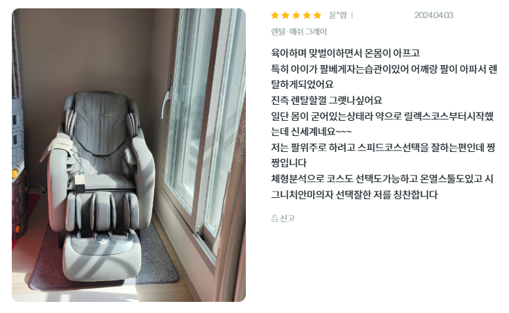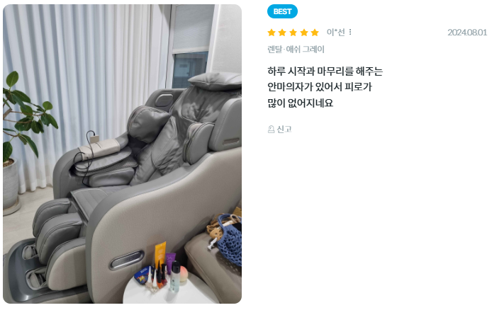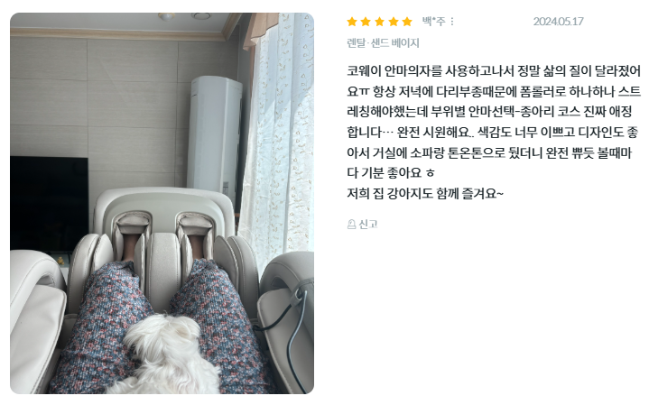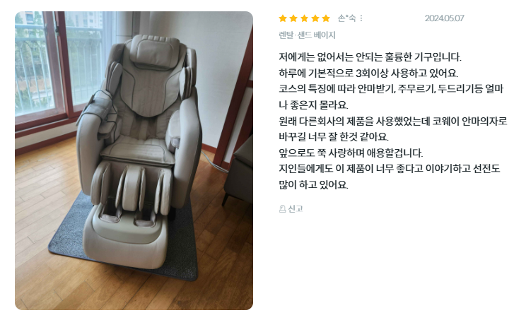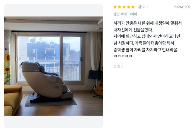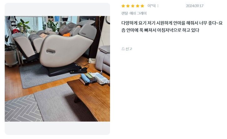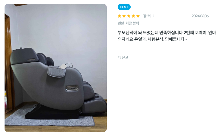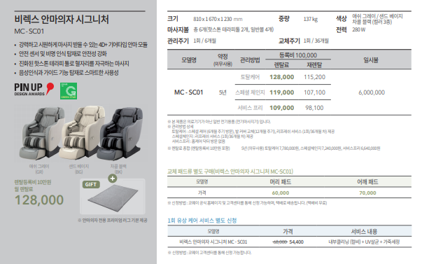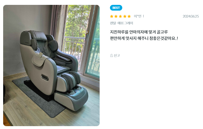 - 기본 제공 품목: 안마의자 전용 프리미엄 러그가 기본으로 제공됩니다.