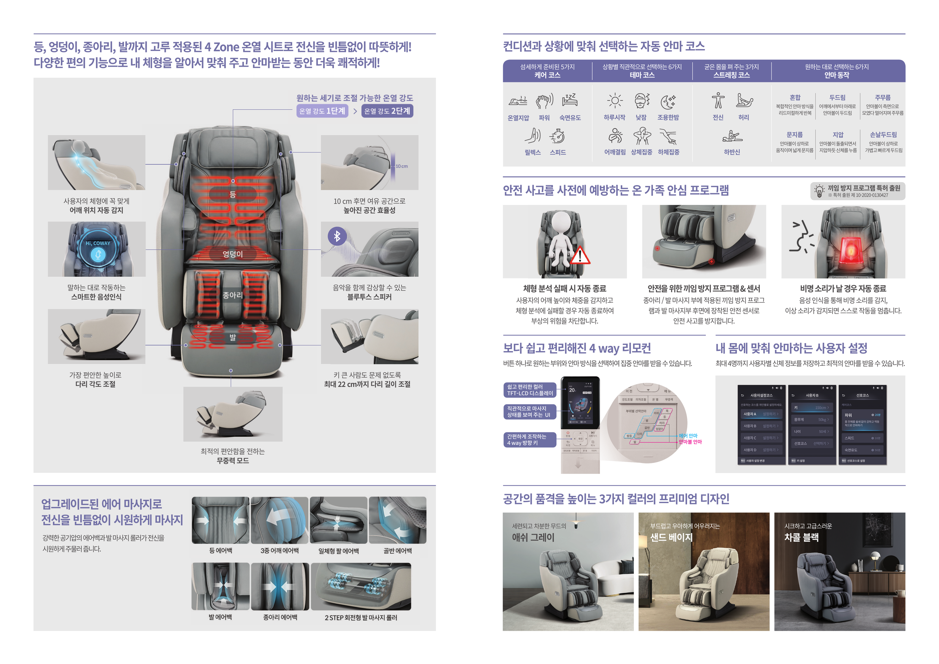 - 강력하고 시원한 마사지: 4D+ 기어타입 안마 모듈이 적용되어 강력하고 시원한 마사지를 제공합니다.