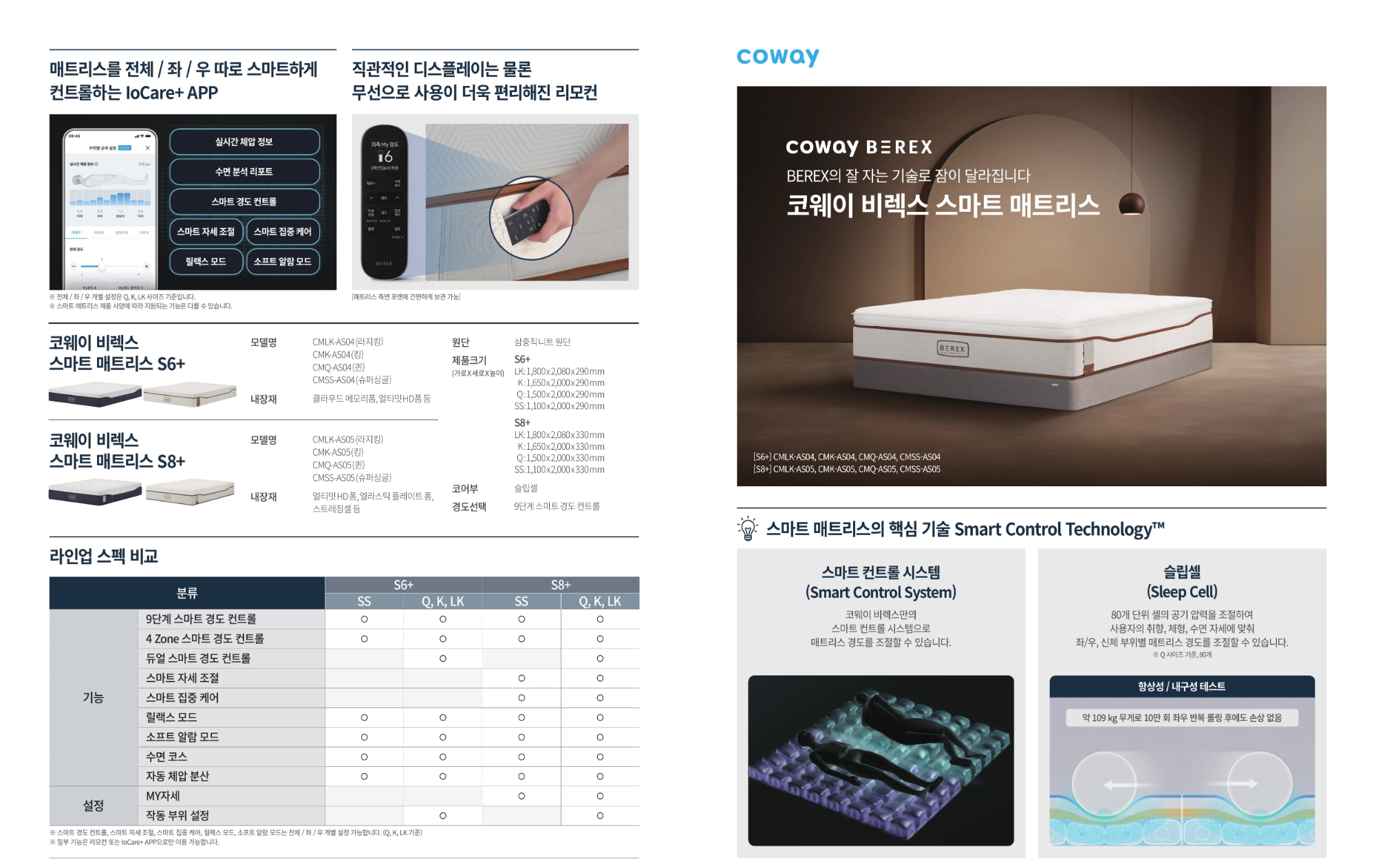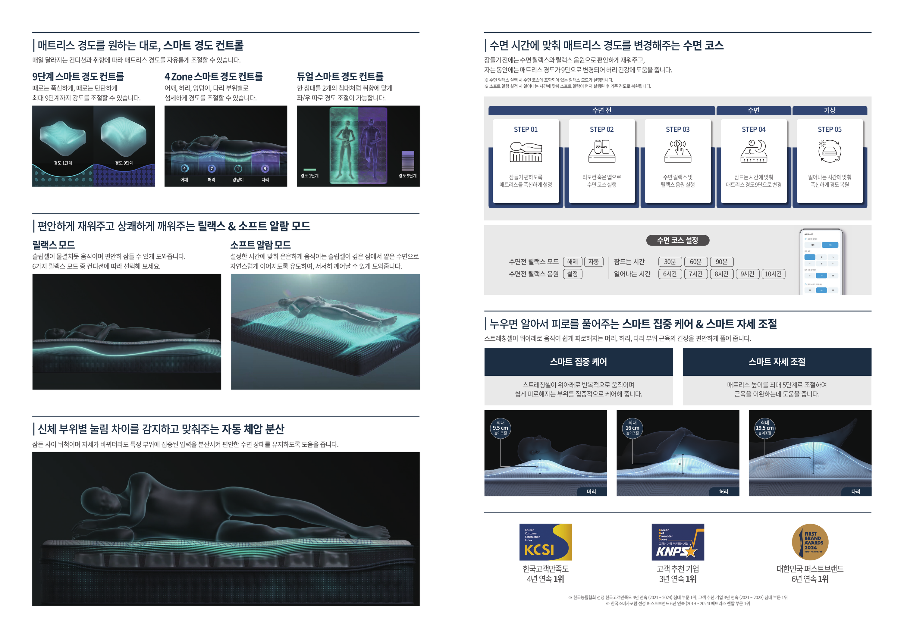 - 스마트 집중 케어 & 스마트 자세 조절: 누우면 알아서 피로를 풀어주고, 수면 전에는 푹신하게, 잠드는 시간에는 9단 경도로, 일어나는 시간에는 다시 푹신하게 경도를 복원하는 수면 코스를 앱 또는 리모컨으로 설정할 수 있습니다.