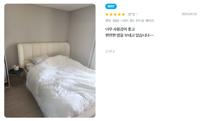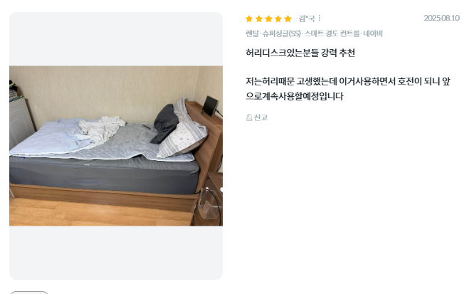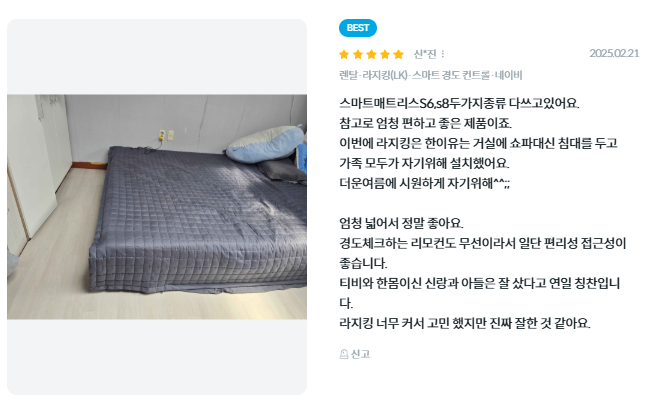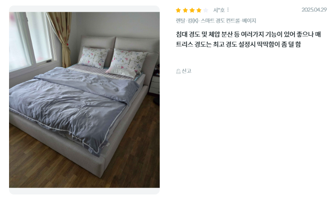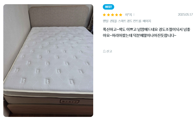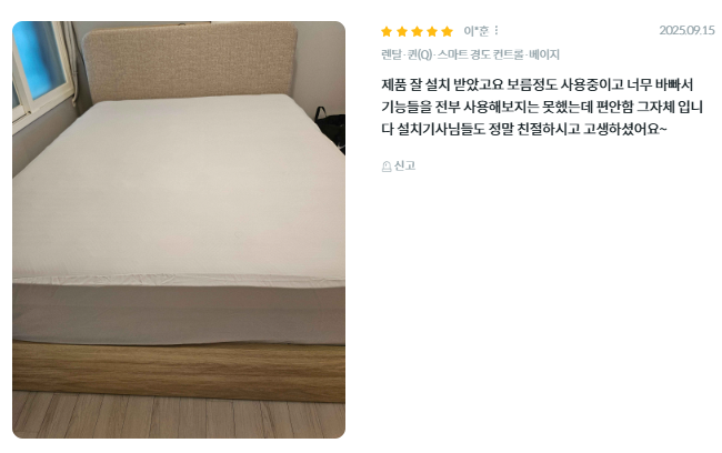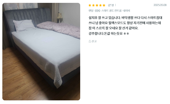 - 스마트 경도 컨트롤: 매트리스 경도를 최대 9단계까지 조절할 수 있습니다. 때로는 푹신하게, 때로는 탄탄하게 원하는 대로 조절이 가능합니다.